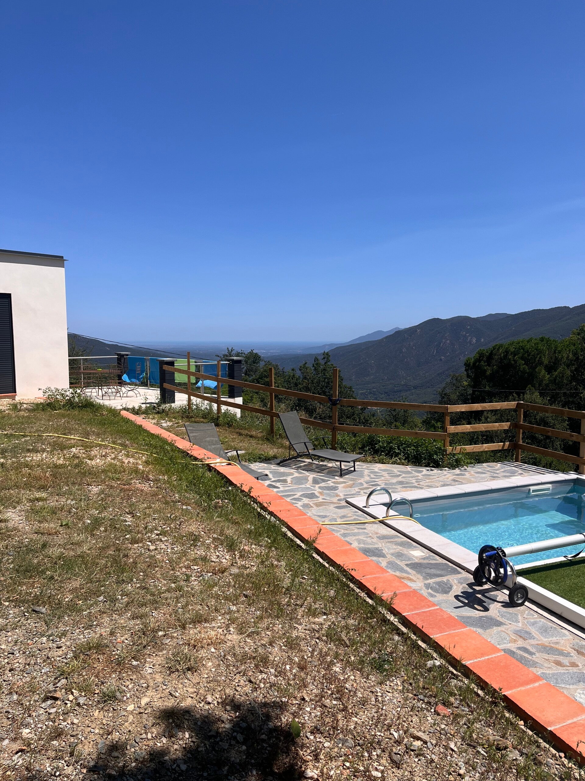 A l'extérieur, profitez d'un jardin arboré et de la terrasse aménagée plein sud offrant une vue panoramique sur les environs. Profitez du soleil toute la journée et d'un cadre exceptionnel pour vos repas ou moments de détente. La piscine privée de 10m2 surplombe la vallée et offre une vue panoramique sur la méditerranée et les montagnes.